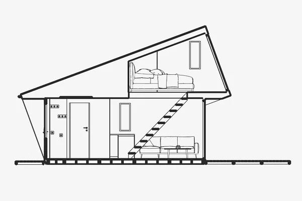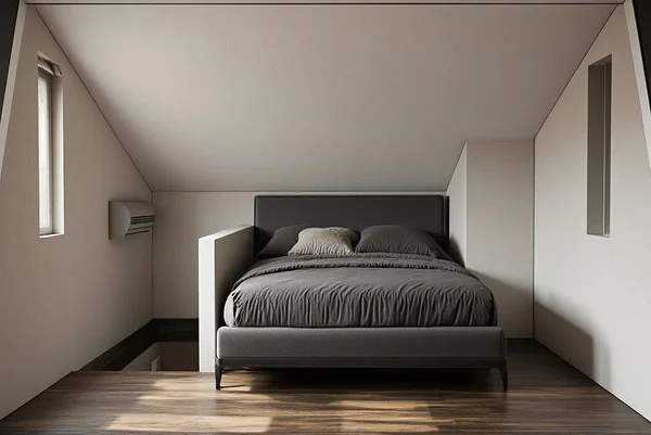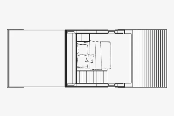 On the second floor there is a bedroom and a storage room behind the back wall. Access to the storage room is from the hallway through a roof hatch.